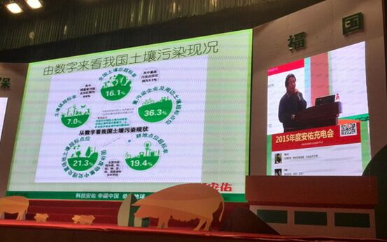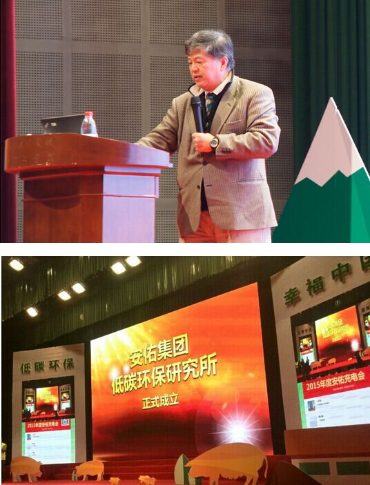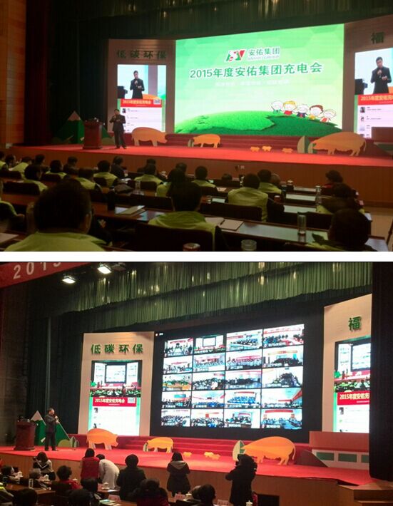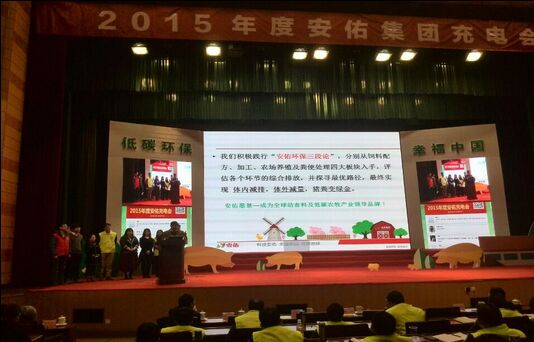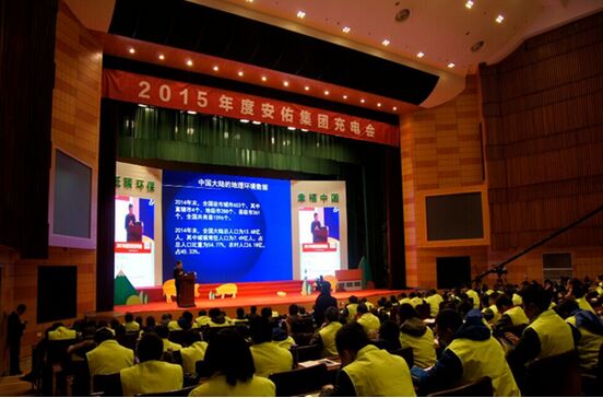 2016年1月11-12日,2015年度安佑充电会在浙江杭州召开,以“低碳环保,幸福中国”为主题,分析中国养殖趋势,推行“低碳养殖”理念。集团董事长洪平先生、公司的其他领导,包括副总裁苏美俐、陈佐邦、段绍均、朱华、赵刚、郑磊,研究院院长汪德中,集团顾问黄涛,助理总裁邬本成,以及来自全国各地700多名安佑小伙伴参加了会议。国际节能环保协会秘书长李军洋出席会议,并作了精彩的主题报告——《绿色低碳与中国发展》。同时,通过网络视频,全国各地安佑31家分公司同步参加了会议,线上线下3000多人积极互动。
