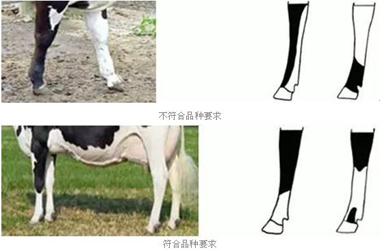 不符合荷斯坦牛的特征:黑色或红色毛发从一条腿或多条腿的蹄部开始不间断延伸至膝部;一条或多条腿环绕黑色或红色毛发并与蹄相连。