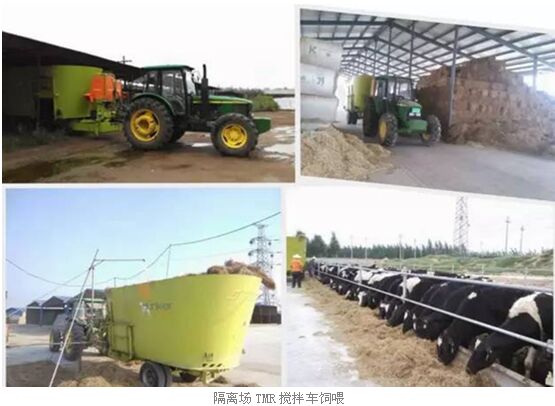 当进口种牛到场后,饲养员会及时核对和登记种牛耳牌,根据体况进行分群管理。隔离期间,种牛采取散放饲养模式。进入隔离场的饲草料须来自非疫区,在检验检疫部门监督下,经过消毒处理后方可使用。为了保证充足新鲜的饲料供给,日粮严格按营养需要采取TMR全混日粮方式供给。