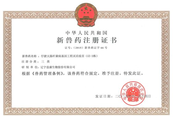 仔猪大肠杆菌病基因工程灭活疫苗(GE-3株)为辽宁益康生物股份有限公司耗时十年、独立自主研发而成,2015年12月14日获得中华人民共和国农业部三类新兽药注册证书。