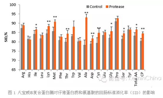 (2)在这样优质原料构成的配方上,补充包被的复合蛋白酶仍可以进一步提高蛋白质和氨基酸的AID和SID值,其中蛋白质的SID由对照组的80.4%提高至84.5%;