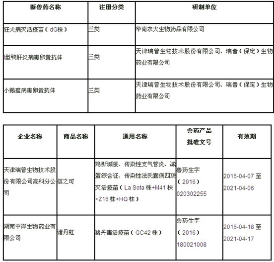 5月10日,瑞普生物公告,瑞普生物及子公司获得由农业部核发的三项新兽药注册证书及两项兽药产品批准文号。