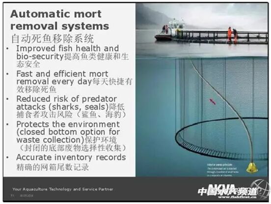 挪威AKVA集团亚洲区总监Bjørn Karlsen有着30年以上在水产养殖业各大供应商工作的丰富经验,对于网箱养殖的设计和原理非常熟悉。在本次会议上,他向与会人员介绍了挪威AKVA集团新设计的“生态网箱”(PET)。这个生态网箱能够更好地应对风暴和恶劣气候,网箱带有自动死鱼移除系统,只需人工操作将沉到底部的死鱼和排泄物通过管道吸入驳船,可以放在水里15年不需要拿出来!
