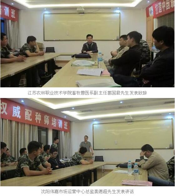 本次大会由沈阳伟嘉技术教练徐同锏老师精彩主持,大会伊始,江苏农林职业技术学院畜牧兽医系副主任葛国君先生发表致辞,对新学员的到来表示欢迎,并简要介绍了该院的建校历史、办学实力,以及携手配种师培训班项目的发展愿景。随后,沈阳伟嘉市场运营中心总监裴德超先生发表讲话,对江苏农林职业技术学院的加盟表示感谢,并阐述校企联手将优势资源最大化利用的重要意义,希望在场所有学员都能学有所得!