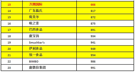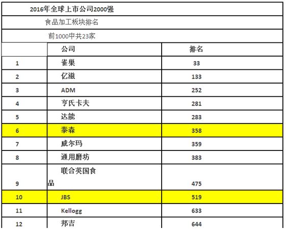 主要同业中,泰森排名第358,JBS排名第519,荷美尔排名第872,巴西食品排名第891,统一排名第954。其中全球食品加工板块前1000名中有23家上市公司如下: