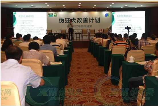 为应对当下伪狂犬阳性率持续攀升发病的困境,7月1日,南宁鹤轩生物科技有限公司联合法国梅利亚,北京康牧众城动物药品有限公司,农财宝典新牧网在荔园山庄展开“伪狂犬改善计划”技术研讨会。在广西兽医领域的颇有声望的广西大学教授陆芹章、黄伟坚、刘芳,佛山科学技术学院猪病室主任白挨泉,广西畜牧兽医学会养猪分会秘书长蒋玲到场讲解,会议有150多位规模猪场负责人到场,包括广西金陵农牧种猪事业部销售总经理黄超、广西农垦永新畜牧集团西江农场总经理助理张胜彬都到场分享了伪狂犬净化经验。