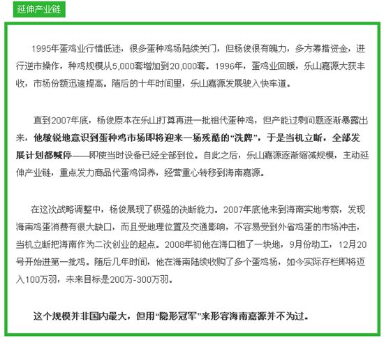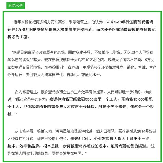 “我没有什么远大理想,最初进入蛋鸡养殖这个行业就是为了吃饭、谋生。温氏才是学习好榜样,嘉源还在摸索中,还有很长的路要走。”这话出自海南嘉源杨俊老板。其实,自改革开放以来,中国蛋鸡业呈快速发展之势,但在优胜劣汰、适者生存的市场法则之下,能够坚持至今,并且发展壮大的蛋鸡企业,确属凤毛麟角。