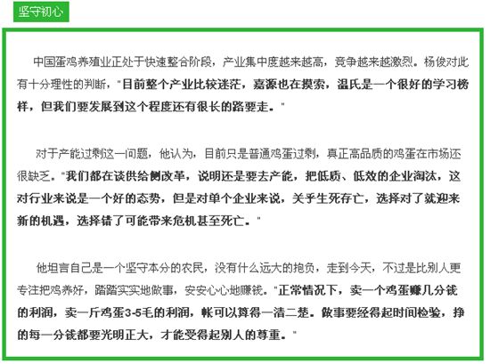 可贵的是,杨俊一直保持低调、务实的风格,不被眼前的成绩迷惑,也不被外界翻天覆地的变化搅动。这么多年来,他极少接受媒体采访,也不愿意在公开场合讲话,因为“总感觉非常别扭”。他说自己就是一个农民,有一身“臭毛病”,非得谈理念、谈文化、谈理想,自己觉得别扭。但一聊到中国蛋鸡业,他会毫无保留地说出很多“干货”,也直言会因某些现象而心生隐忧——或许只因盼其更好。