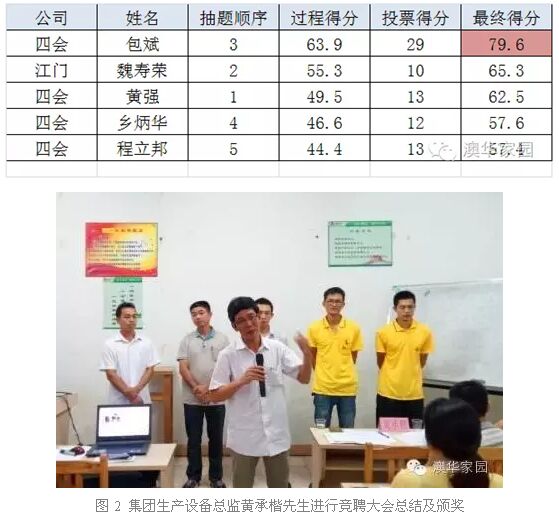 其中,四会澳华生产部包斌表现尤其突出,根据生产部现有情况提出了自己对生产部管理与运营思路的改进意见,针对车间如何突破极限产能提出了自己的解决措施和方法,对于评委提出的问题,亦能从容不迫、谦虚请教、应对自如。最终包斌以总分79.6分当选生产部副经理。