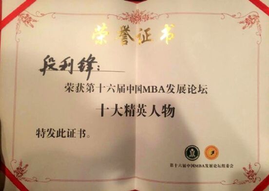评选2016年度“中国MBA十大精英人物”是论坛的一项重要活动。集团总裁段利锋与北京大学、中国人民大学等著名高校及各行业优秀企业家候选人,共同荣获2016年度“中国MBA十大精英人物”。