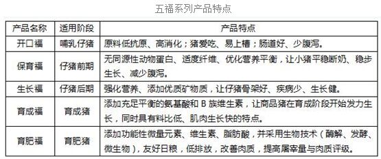 五福系列针对商品猪从哺乳仔猪到育肥猪的全程,使其达到最适生长曲线,也为客户带来最大“福气”的效益。
