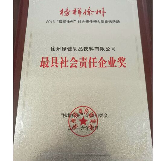 近日,在徐州报业传媒集团主办的2016“榜样徐州”企业社会责任大型公益推选活动上,绿健乳业荣获“最具社会责任企业奖”。