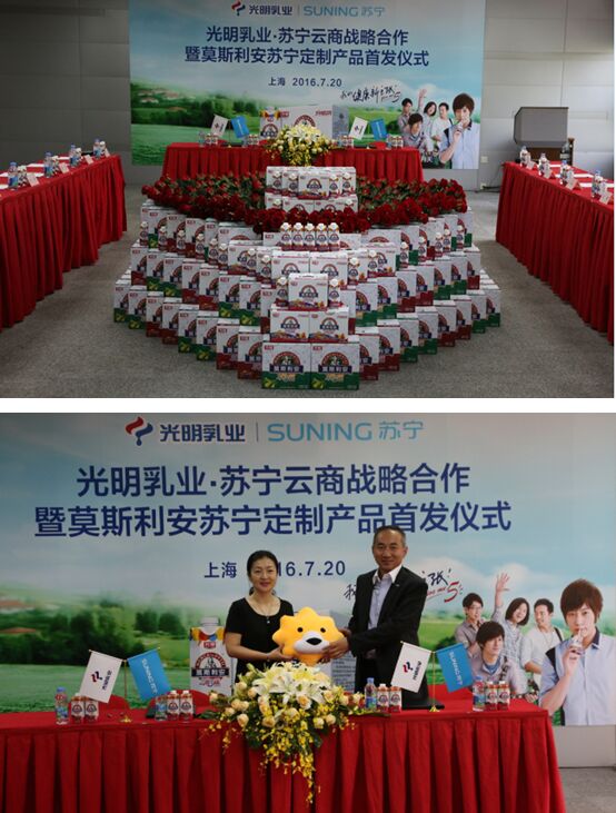 2016年7月20日下午,光明乳业副总裁李柯与苏宁云商营销总部副总裁田睿签署战略合作协议,并现场发布苏宁定制款——350g莫斯利安2果3蔬。未来在大的战略合作背景下,双方将共享优势资源,共同完善O2O营销模式,为消费者提供更加便捷的消费服务。