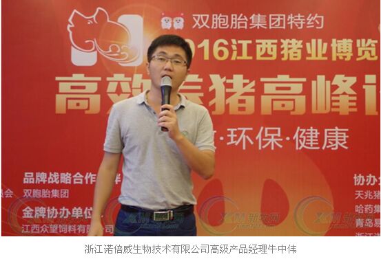 烈日当空,热情似火。7月22日,来自江西各地的养殖业内人士群英荟萃,景从而至南昌国际展览中心,参加双胞胎集团特约2016江西猪业博览会。会场不仅有缤纷的活动,亦有精彩的讲课。来自浙江诺倍威生物技术有限公司(以下简称诺倍威)高级产品经理牛中伟为参加此次博览会的江西养殖业朋友分享有关诺倍威高效养殖的实践。