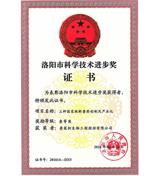 近日,由普莱柯生物工程股份有限公司、洛阳惠中兽药有限公司及国家兽用药品工程技术研究中心联合申报的“三种国家级新兽药创制及产业化”项目获洛阳市2016年科学技术进步“一等奖”。