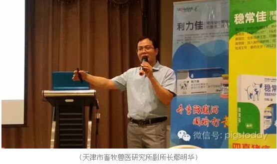 现今,困扰养殖户的两大疾病,一是圆环,二就是腹泻。而最为腹泻的头号杀手---流行性腹泻病毒,为什么猪场的感染率会如此之高?天津市畜牧兽医研究所副所长鄢明华也来到现场和大家做了专题汇报。鄢明华所长从仔猪腹泻传播特点、临床特点及危害等方面发表了自己的观点,并展示了部分他的最新研究成果,他认为,在腹泻疫病防控过程中,养殖户要想使疫苗的效果很好发挥出来,必须得重视生物安全。同时要重视和加强消灭传染源、切断传播途径的生物安全措施。