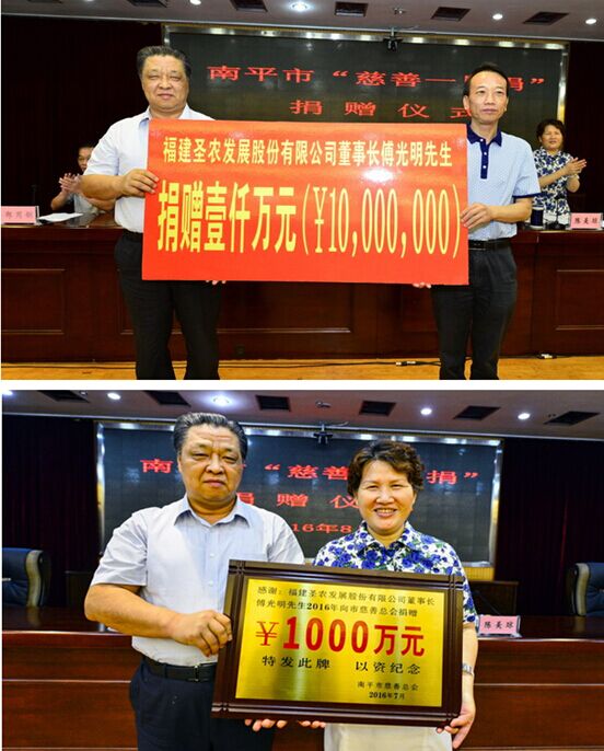8月3日,2016年南平市“爱心助学?慈善一日捐”捐赠仪式在延平举行。南平市慈善总会会长、福建圣农发展股份有限公司董事长傅光明捐赠1000万元。迄今为止,傅光明董事长向市慈善总会累计捐款9000万元。