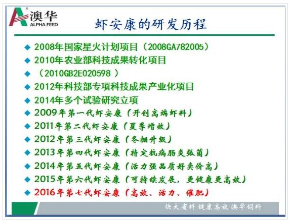 虾安康系列产品正是从这些问题入手,早在2005年底,澳华集团王平川董事长与中国海洋大学谭北平教授共同探讨,在行业内首次提出高免疫抗应激型保健对虾饲料——虾安康的研发思路。采用最新鲜最优质的原料,通过精心调配,优良的产品品质成了虾安康与其他虾料产品最大的区别。用王董事长的话说就是“做行业中有良心的买手”。可以说澳华这个开放包容的平台创造出了虾安康这样优秀的产品,而虾安康也成就了澳华在行业中的地位,澳华式的差异化已经成为行业中的热门话题。产品的热销必定离不开研发的进步。早在2006年,“虾安康之父”邓登博士提出了开发一款高效免疫性对虾配合饲料,并在2009年虾安康推出市场之际就为产品定下了小步快跑的迭代升级理念,每次更新换代专注解决一种对虾养殖难题,因此从2009年开始几乎每年都有新一代的虾安康问世。