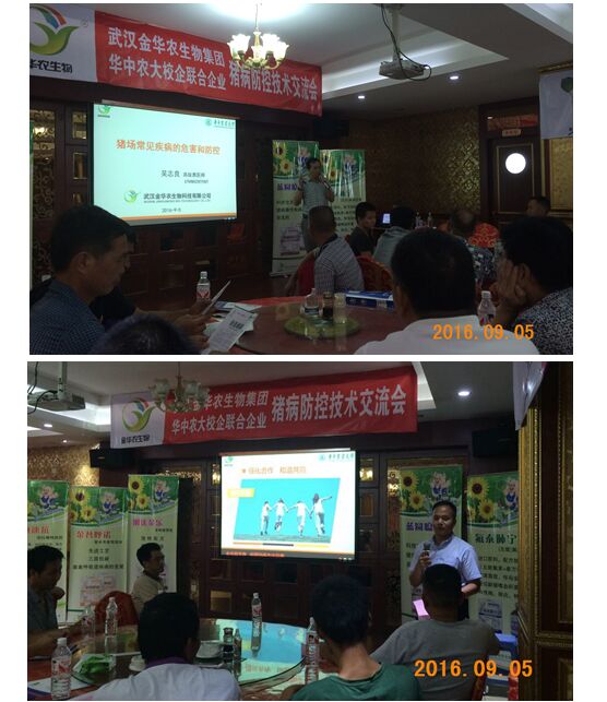 2016年9月5-6日,武汉金华农生物科技有限公司“夏秋季常见易发猪病研讨会”在福建南平胜利召开,按公司预定计划、陆续在全国重点省内全面展开。公司常务副总经理徐巍博士、公司运营部主管李名娥老师等人出席本次会议,会议主讲由公司技术部吴志良老师领衔主讲,南平地区战略合作伙伴张总、魏总共同策划组织。