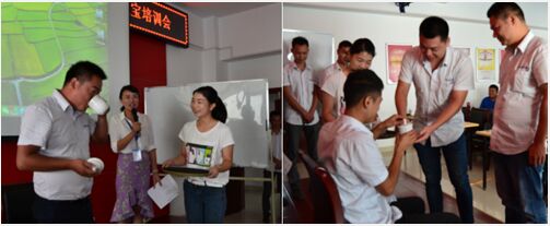 金霞九鼎养猪服务培训班采取“师带徒”的模式,公司领导与综合服务部经理经过仔细研究,决定从当前的营销队伍中选取8人作为第一批转型升级人员,从由四位综合服务部具有丰富的驻场经验、过硬的服务能力与技术的服务老师来担任此次培训班的师父,带领徒弟学习相关服务技能。开班仪式上最重要的环节是沿用了传统的拜师敬茶仪式,舞台上徒弟们一个个双手托着茶杯并鞠躬敬茶,师父们也都是一脸微笑地满饮徒弟们奉上的茶。一杯茶、一份情,徒弟们奉上的是孝敬与信任,师父们喝下的是责任、承诺与期望!