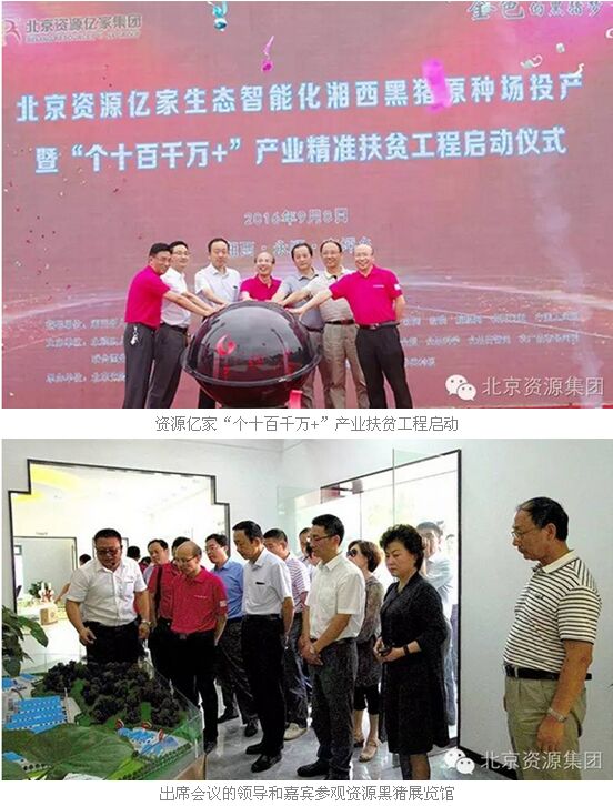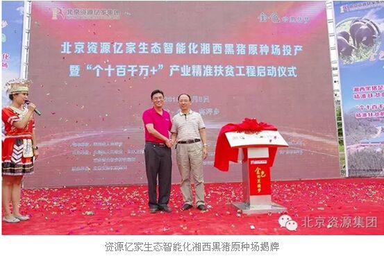 2016年9月8日9点18分,北京资源亿家生态智能化湘西黑猪原种场投产暨“个十百千万+”产业精准扶贫工程启动仪式在永顺县高坪镇那咱村隆重举行。湖南省扶贫办开发指导处处长全永海,湘西州副州长何益群,湘西州驻京办主任潘秋桂,湘西州农委、党组副书记谷仙玉,湘西州畜牧水产局局长胡丕忠,吉首市副市长谢党,永顺县委常委、常务副县长提名人田源,永顺县委常委、副县长李选锋,北京资源亿家集团董事长刘钧贻等出席仪式。