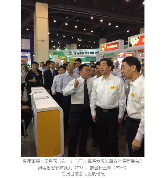 开幕式结束后,在侯建芳的陪同下,河南省省长陈润儿、副省长王铁视察参观了雏鹰农牧集团展台,侯建芳向省领导汇报了公司目前的发展情况,并邀请省领导品鉴了即将上市的东元发酵火腿产品。