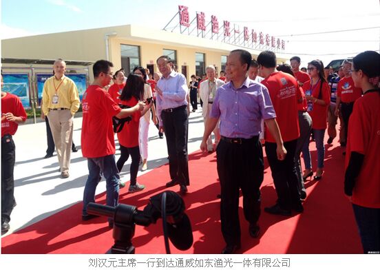 9月20日上午,天朗气清,各路重磅领导、嘉宾齐聚如东,前往通威如东“渔光一体”基地参观。在刘汉元主席的陪同下,农业部渔业渔政管理局副局长李书民,全国水产技术推广总站站长肖放,全国水产技术推广总站副站长李可心,全国水产技术推广总站示范处处长高勇,中国能源经济研究院副院长、首席光伏产业研究员红炜,中国光伏农业工作委员会会长张勇,中国光伏农业设计研究院首席农业专家、荣誉院长冯玉林,农业部渔业渔政管理局副处长王雪光,中国水产科学研究院科研处副处长刘永新到达通威如东渔光一体有限公司。