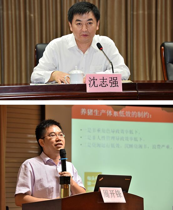 本次会议由山东省滨州畜牧兽医研究院科技处处长、山东省现代农业技术体系生猪综合试验站站长李峰研究员主持,全国人大代表、山东省农业专家顾问团专家、山东省滨州畜牧兽医研究院院长、山东绿都生物科技有限公司董事长、国家有突出贡献中青年专家沈志强研究员;滨州市畜牧兽医局田茂俊副局长;山东畜牧业协会生猪产销分会副会长兼秘书长周开锋研究员等分别致辞。沈院长代表山东省滨州畜牧兽医研究院及绿都生物工程高科技园全体员工对大家莅临本次会议表示热烈的欢迎,对各位专家百忙之中挤出时间到会报告,共同探讨推广高效健康养猪新技术表示衷心的感谢!他向大家介绍了山东绿都生物工程高科技园在机构组成、研学产合作创新发展、中外合作交流、人才团队和平台载体建设等方面的情况,并指出举办本次会议的目的是让养殖场寻找和把握生猪产业发展的趋势和内在特征;同时请各界人士以此次会议为契机,互相学习交流,为生猪产业发展做出积极的贡献。