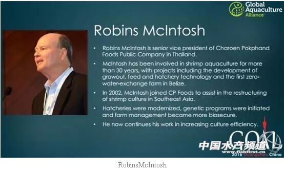 罗宾斯·麦金托什(RobinsMcIntosh)现为泰国卜峰的高级副总裁,参与对虾产业超过30年时间,负责的项目包括亲虾、饲料、孵化技术以及建立巴西第一个零换水养殖场。2002年,罗宾斯加入卜蜂,负责其在东南亚的重组工作,以及孵化场的现代化改造、发起对虾遗传计划、养殖场生物安保管理等,现在,他仍致力于提高水产养殖的效率。
