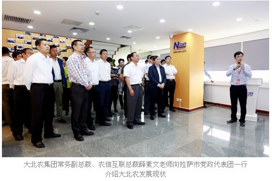 2016年9月23日上午,西藏自治区党委常委、拉萨市委书记齐扎拉等32位拉萨市党政代表莅临大北农集团中关村总部考察。大北农集团董事长、总裁邵根伙,大北农集团常务副总裁、农信互联总裁薛素文等接待拉萨市党政代表团一行,薛素文老师向考察团一行汇报了大北农集团立足中关村、服务大农业的工作情况。