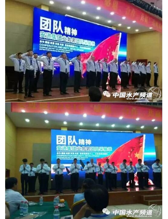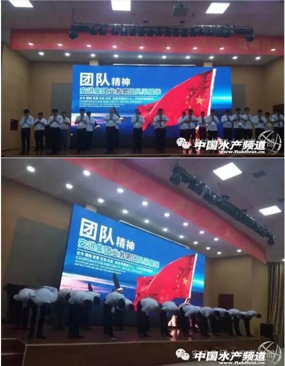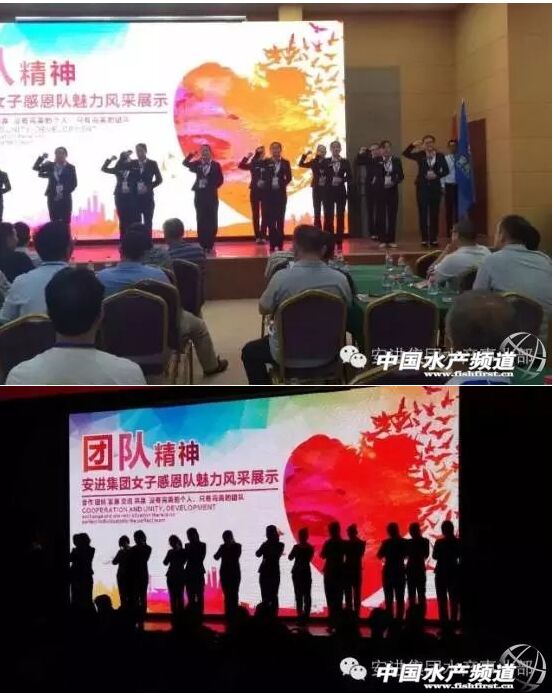 会议伊始,安进水产王牌男团战将们气势磅礴地给远道而来的贵宾呈现了我们安进水产男团的魅力风采展示,充分展现了企业文化在企业中的核心凝聚力,第一拜,感谢家人给予支持,第二拜,感谢公司为我们搭建平台,第三拜,更是感谢同事给我力量,感谢客户助我成长!