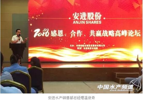 温俊奇:安进水产携手客户感恩、合作、共赢 “现代竞争总体来说就是资源的竞争,进行资源整合,更好地为养殖场服务才是经销商们现阶段的出路。”年度论坛上,安进水产销售部总经理温俊奇也作了《感恩、合作、共赢》专题报告。他对竞争的起源、竞争的发展、现代竞争战略理论的发展进行了精彩剖析。他表示:“ 我们的战略高度决定了我们的格局,而格局又决定了我们的舞台的大小。