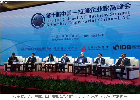 10月14日,第十届中国-拉美企业家高峰会在河北省唐山市隆重开幕。国家主席习近平发来贺信,对高峰会召开表示热烈的祝贺,国家副主席李源潮、乌拉圭总统塔瓦雷•巴斯克斯出席开幕式并致辞,中拉国家政府部门、商协会及企业代表等约1500人共赴盛宴。牧羊有限公司董事、国际营销总裁刘广道应邀出席大会并发言。