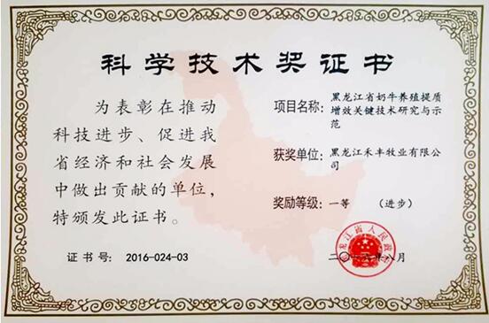 黑龙江禾丰参与的科研项目 荣获2016年黑龙江省科学技术进步一等奖