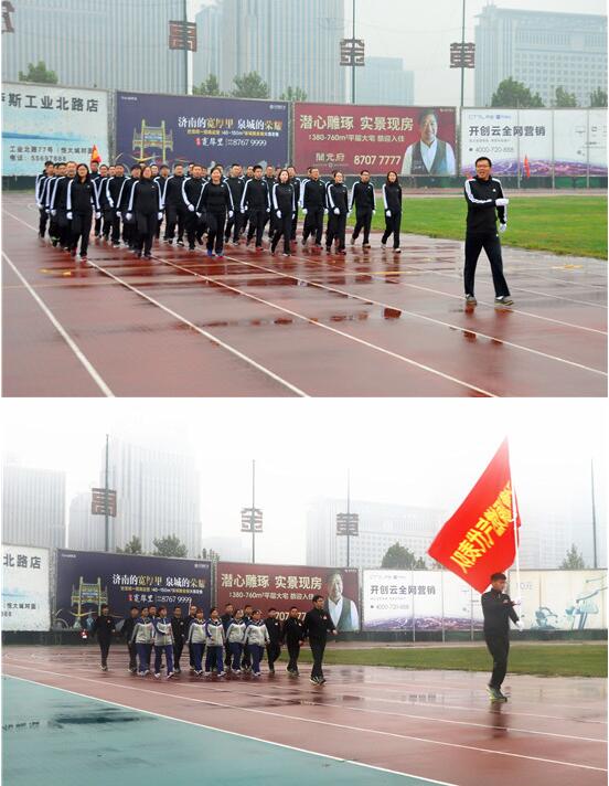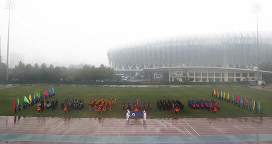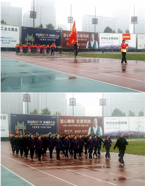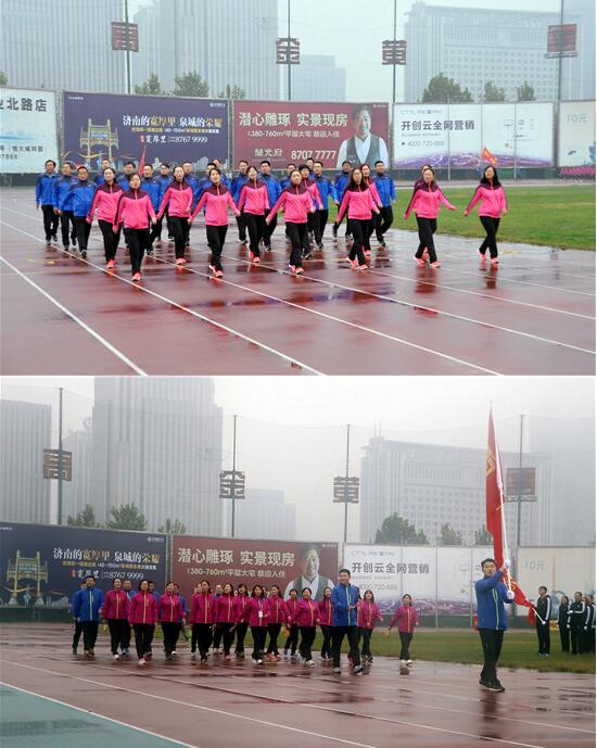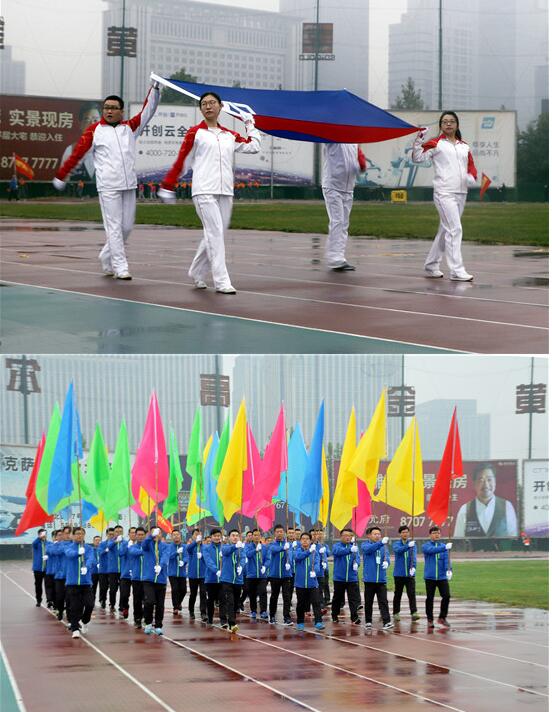 风雨交加的天气给运动会的进行带来了压力和阻力,但仍然抵挡不住员工们的参与热情。上午8点左右,工会主席宋黎女士宣布开幕仪式正式开始。在激昂的旋律中,公司司旗护旗队、彩旗方队以及由总部和各个产业组成的6支代表队昂首阔步依次进入会场,接受主席台的检阅。随后,大会组委会主任、董事长王鹏先生致开幕词。
