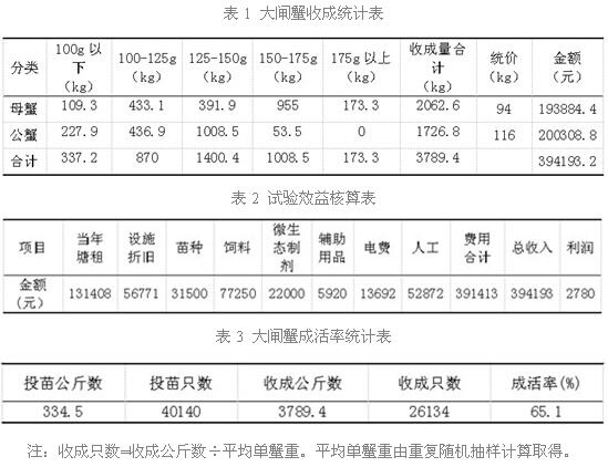 以上三个表的数据表明,总产量3789公斤,总产值394193元,总费用391413元,总利润2780元。大闸蟹成活率65.1%,与长江水域养殖相当。但试验结果未能达到预期经济效益,究其原因主要是养成的大闸蟹未能达到预期规格(只重200克以上),因而价格偏低(不到预期价格的二分之一)。