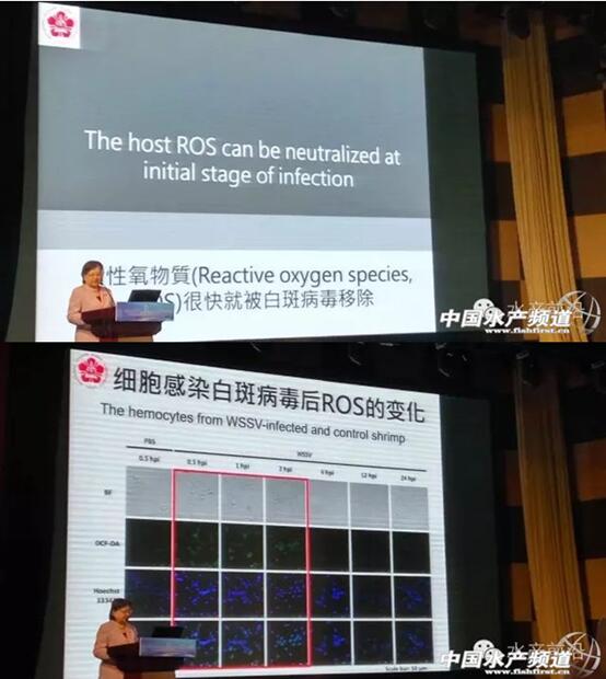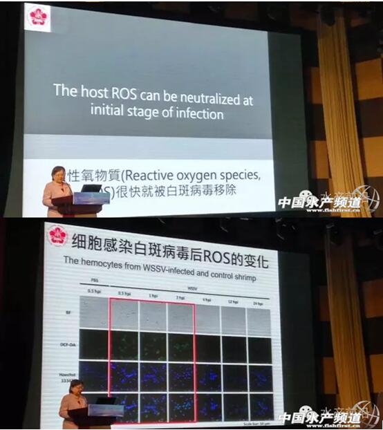 “当白斑病毒入侵虾的机体时,细胞会产生活性氧物质(ROS)进行对抗,但实验证明,细胞被白斑病毒感染后,所产生的ROS 在6小时后就不在了,说明虾与白斑病毒交互作用时,病毒都可克虾的防御系统,并将ROS移除。”
