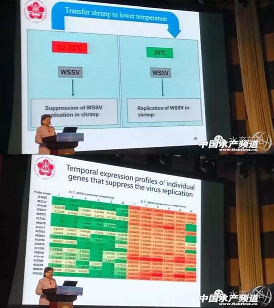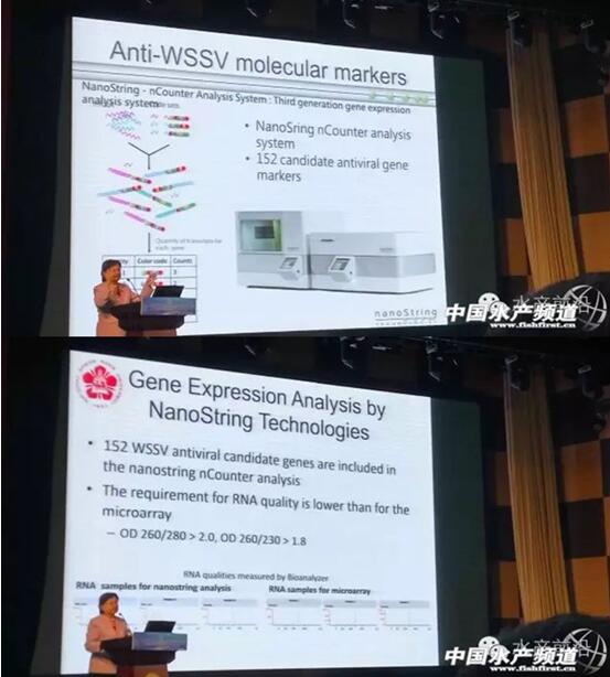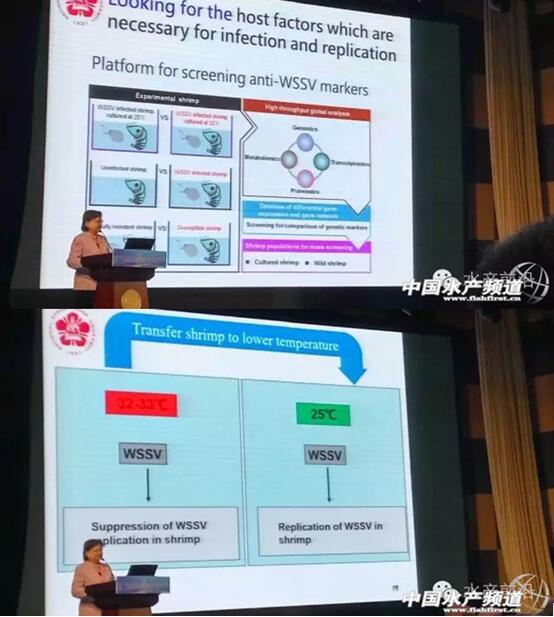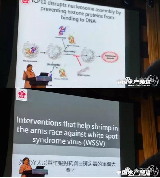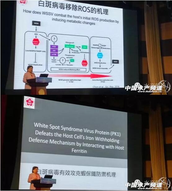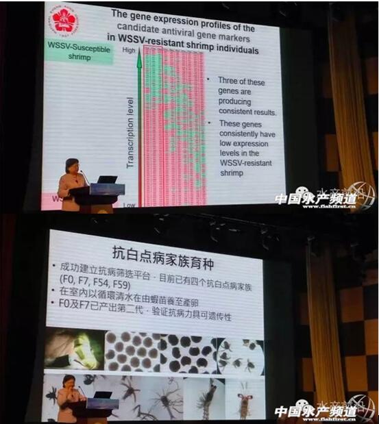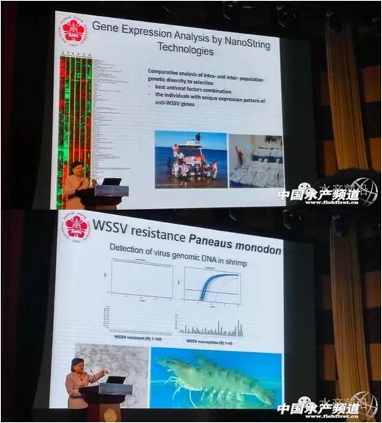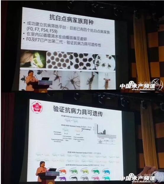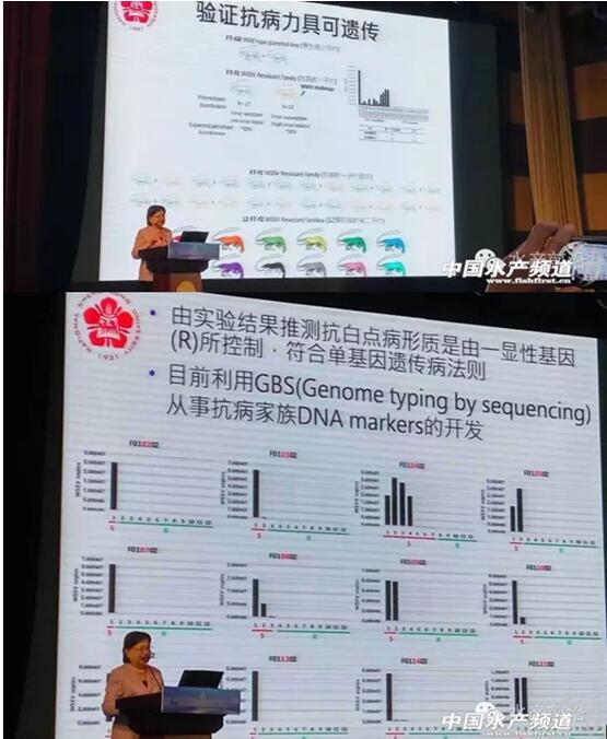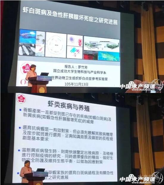 来自台湾成功大学的罗竹芳老师做了《虾白斑病及急性肝胰腺坏死症的研究进展》的报告,详细地解释了虾在选育对抗白斑病毒品种上的原理,引起了与会人员的重要关注。