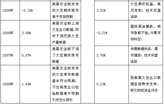 二、过去10年USDA报告产量、库存调整趋势及对行情的影响 通过观察过去10年的数据我们可以发现,USDA12月供需报告公布当天,芝商所旗下CBOT大豆期价在过去10年间有6年下跌,3年上涨,1年持平,下跌概率60%,报告后的一周(包括报告公布当天),CBOT大豆期价在过去10年间有6年下跌,4年上涨,下跌概率同样为60%。也就是说从往年规律来看,USDA12月供需报告之后,芝商所旗下CBOT大豆跌多涨少。