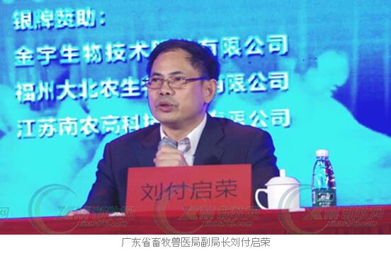 广东省畜牧兽医局副局长刘付启荣致辞介绍,广东是畜牧业的大省,2015年广东的全省肉类总产量424万吨,生猪出栏3634万头,生猪出栏量居全国第六位,全省的饲料总产量2573万吨,产值962亿元,产量全国第一,占全国的1/8。