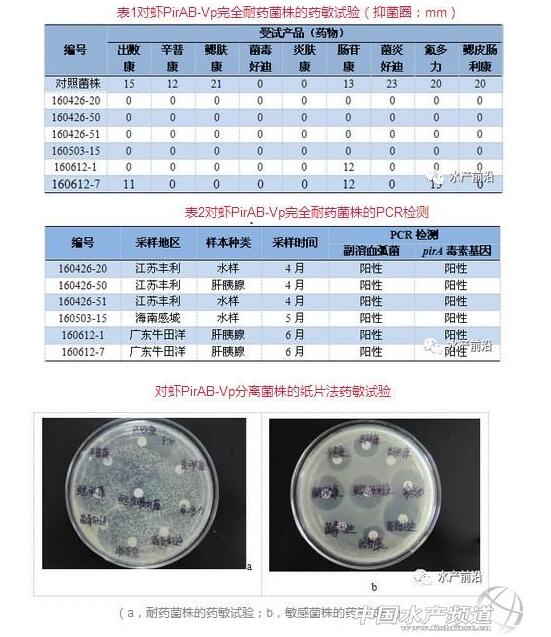 在养殖南美白对虾发病时,采集病虾的肝胰腺的和水样,接种TCBS平板。然后,送利洋公司研究所进行PirA毒素基因的PCR检测,并对阳性菌株做药敏试验分析。