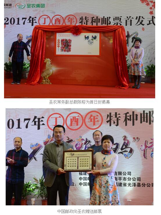 首发揭幕仪式由光泽县人民政府、圣农集团携手中国邮政集团公司光泽县分公司联合主办,圣农集团常务副总裁陈榕为首日封揭幕,并在首发式上讲了话,她说邮票被誉为国家名片,是特殊的文化传播媒介,而生肖是产生于我国的一种古老民俗文化现象。鸡在中国十二生肖中排名第十,代表着诚信,象征着吉祥。特种邮票的发行,将有利于树立圣农集团新形象,促进企业文化建设的提升,打造出企业对外交流的新载体。
