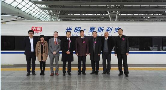 上午10点,光明乳业冠名的“光明莫斯利安”高铁品牌专列准时从上海虹桥站驶出前往北京。正式发车前,上海铁路文化广告发展有限公司副总经理沈鹏先生,光明乳业股份有限公司董事长张崇建等领导共同出席了“光明莫斯利安高铁”首发仪式并剪彩,正式宣布“光明莫斯利安”高铁品牌专列正式首发!