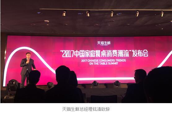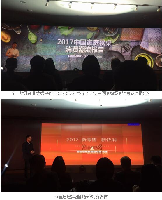 会上,天猫联合第一财经商业数据中心(CBNData)发布了《2017中国家庭餐桌消费潮流报告》,详细解读了国民餐桌消费的最新趋势。报告显示中国居民的饮食需求正在加速从基础需求向更高层次升级。中国消费者越来越愿意为质量可控、营养均衡、选择丰富和加工便捷的食材买单。而以“鲜”为主题的蔬菜、水果、肉禽、水产则成为餐桌消费升级的核心。随后,阿里集团副总裁靖捷就天猫未来新零售生态布局以及品牌营销、渠道拓展与产品升级的新发展方向进行了详细解读。