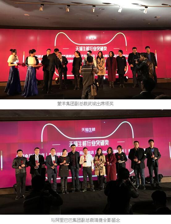 在本次年度大会上,蒙羊凭借2016年在生鲜领域的出色表现,从全国2000多个生鲜企业中脱颖而出,获得了由阿里官方颁发的“2016天猫生鲜行业突破奖”,再次印证了蒙羊品牌在消费者认知与生鲜市场的领先地位。