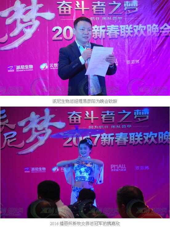 刚刚荣获由农财宝典新牧网主办的2016播恩杯新牧女郎总冠军的派尼生物魏嘉欣在晚会上通过一支曼舞《青花瓷》为本次年会助兴,各大区派出的舞蹈、小品等节目也让现场嘉宾一饱眼福,笑声迭起。派尼生物总经理易彦阳在晚会中表示,派尼生物将冠名2017年的新牧女郎活动。