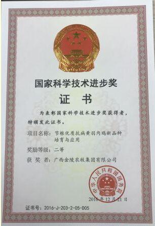 2017年1月9日,国家科技奖励大会在北京人民大会堂召开,由广西金陵农牧集团和中国农业科学院北京畜牧兽医研究所等单位联合实施的《节粮优质抗病黄羽肉鸡新品种培育与应用》项目获得国家科技进步奖二等奖。