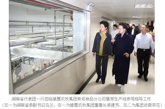 4月14日上午,湖南省代表团一行由湖南省委副书记乌兰带队,莅临雏鹰农牧集团进行参观调研,集团董事长侯建芳、副董事长侯五群、总裁李花等领导热情接待并进行全程讲解。