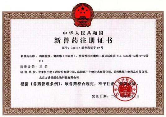 根据《兽药管理条例》和《兽药注册办法》规定,经农业部审查,批准普莱柯生物工程股份有限公司、洛阳惠中生物技术有限公司共同申报的“鸡新城疫、禽流感(H9亚型)、传染性法氏囊病三联灭活疫苗(La Sota株+SZ 株+rVP2蛋白)”为新兽药,并于2017年5月18日农业部网站公示了核发《新兽药注册证书》(农业部公告第2525号)事项。