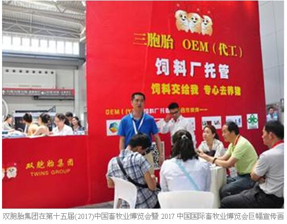 2017年5月18-20日,第十五届(2017)中国畜牧业博览会暨2017中国国际畜牧业博览会在青岛国际博览中心举行,双胞胎集团组团参加了本次盛会,在会上的宣传主题为“三胞胎OEM(代工),猪场饲料厂托管,饲料交给我,专心去养猪。分别展出双胞胎集团与中粮集团、温氏集团、天兆集团、北京六马集团、立华集团、天邦集团等大型企业合作的案例,双胞胎集团本年度的宣传主题得到了众多业界人士的高度重视,猪场和业界朋友纷纷前领取资料,人流在此汇集,商机在此凸显,合作在此升华。